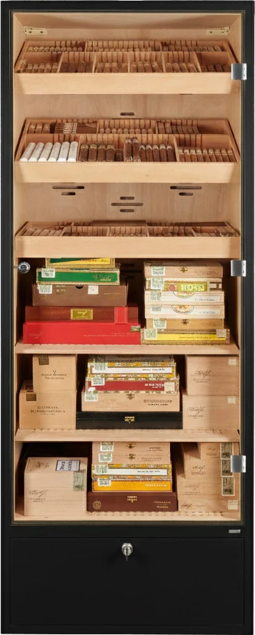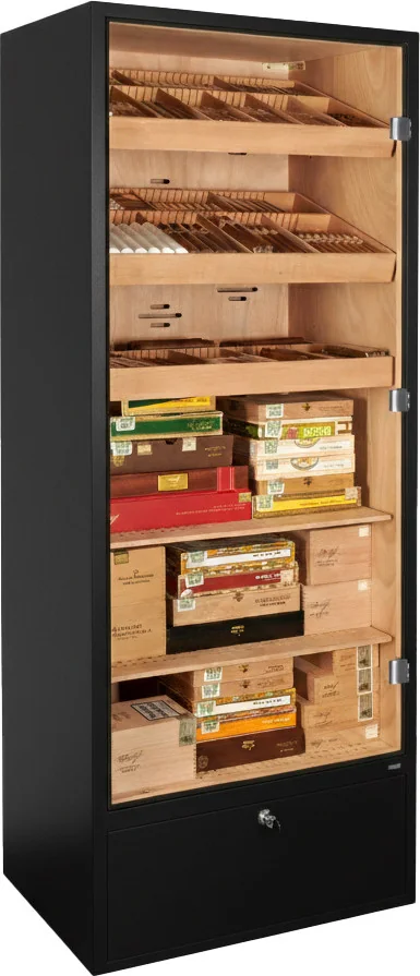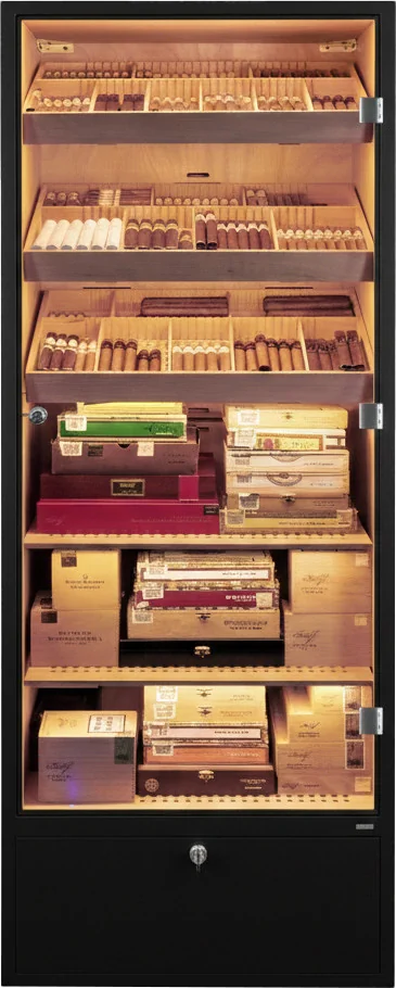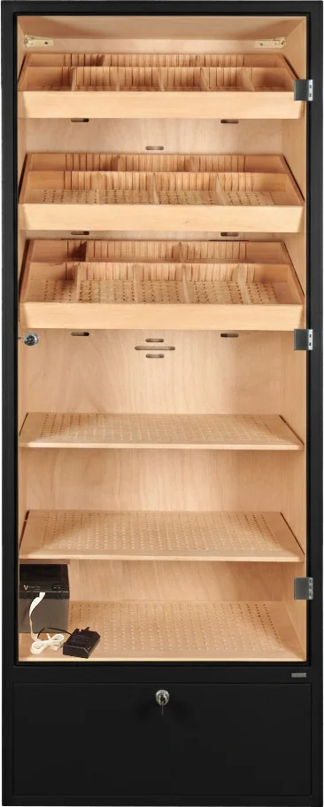 The humidor cabinet offers space for approximately 2800 cigars, calculated based on the classic Mareva format. Storage is designed for both individual cigars and entire boxes. The interior is divided into six levels and equipped with three trays and two shelves.