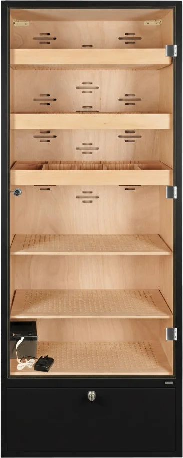 The base of the humidor cabinet contains a lockable drawer that can be used for storing cigars as well as accessories or consumables such as distilled water. The drawer bottom is perforated and separated from the interior, allowing humidity to circulate and ensuring safe cigar storage.