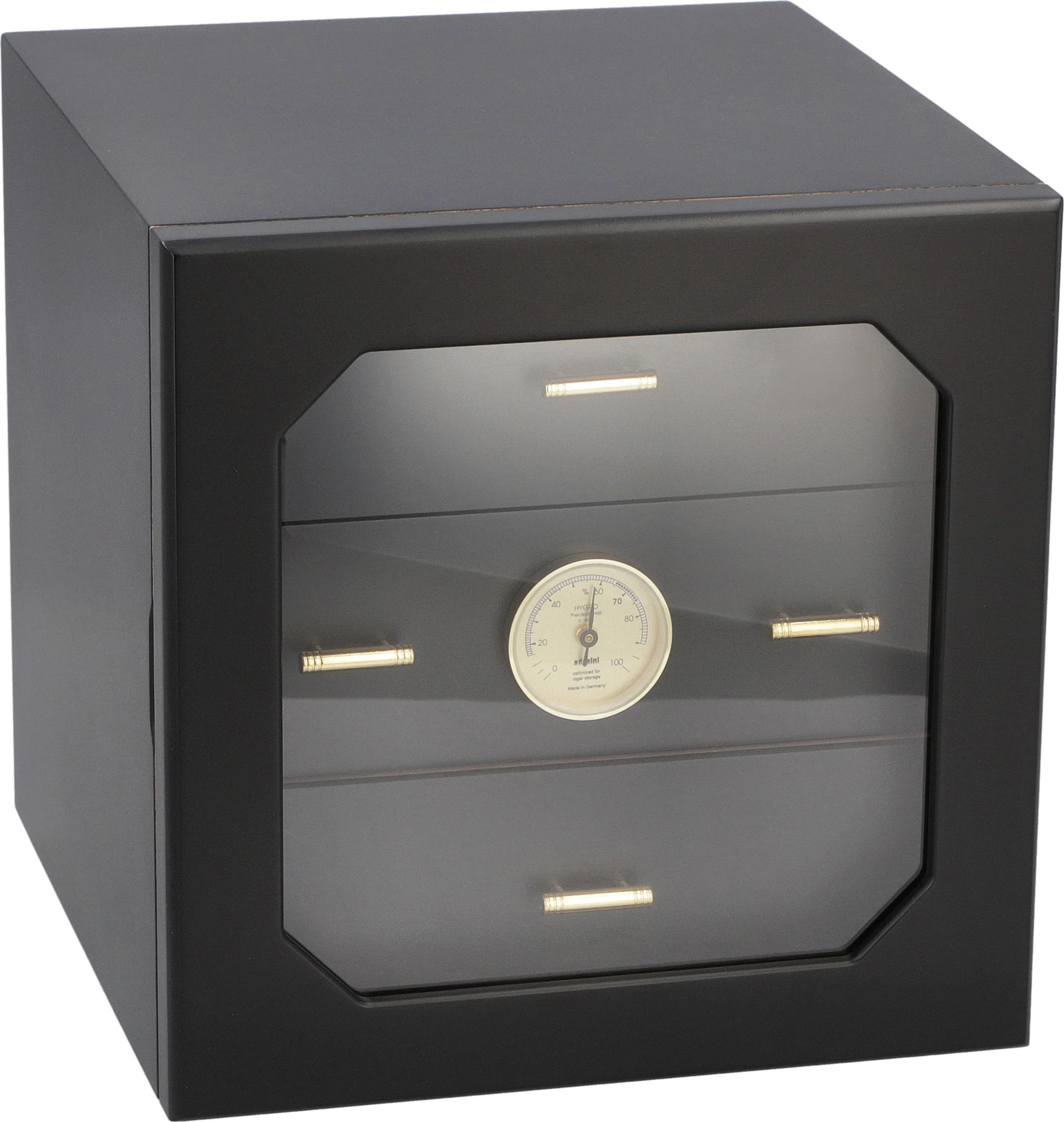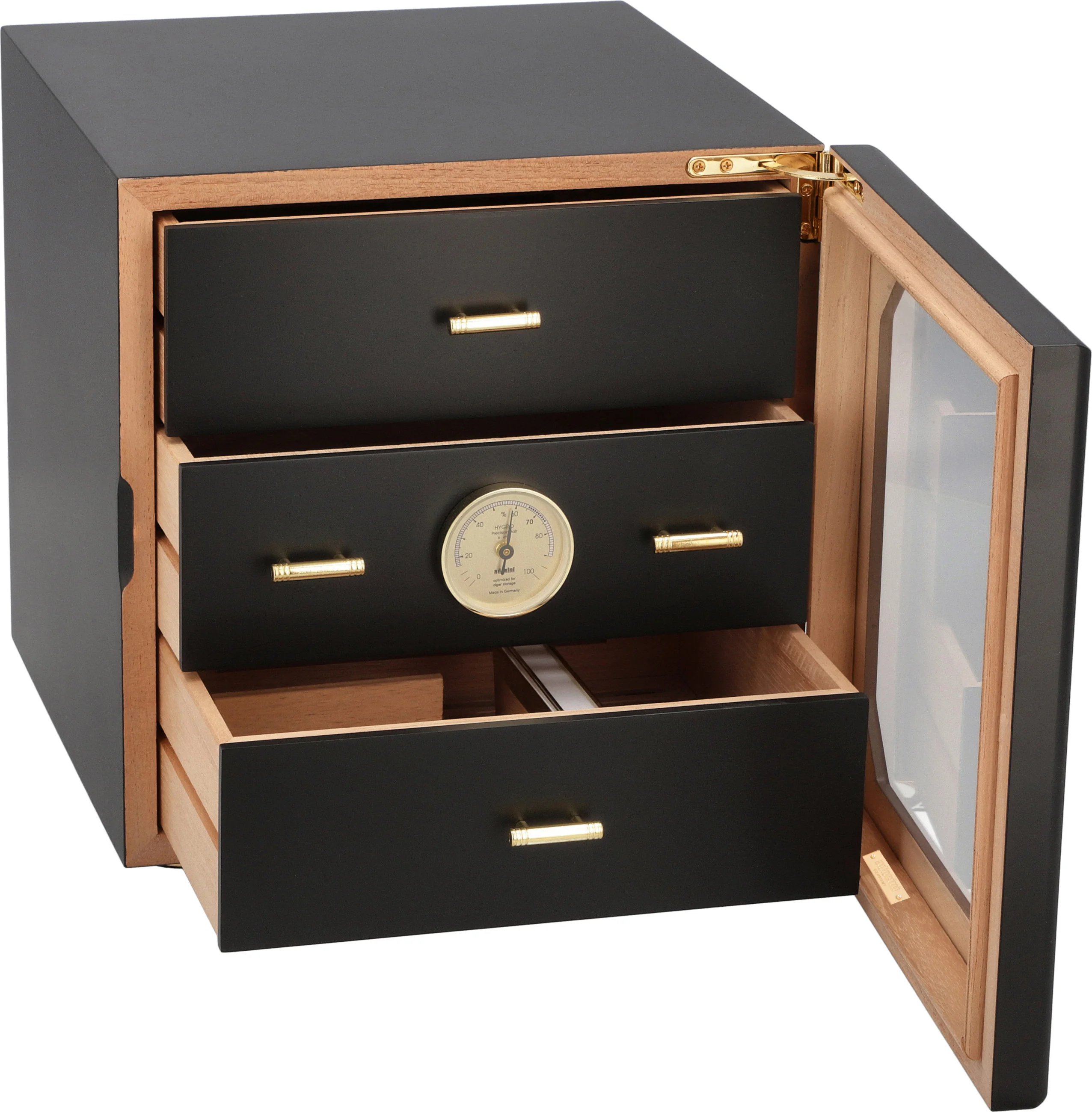This wildly popular cabinet humidor brings an elegant symmetry to the cigar storage experience with a stylish yet functional cube-shaped design. A multi-lacquered matte finish joins gold-plated accents and a glass viewing pane built into the door to make the humidor an efficient and pleasing addition to any décor. Over 125 Corona-size cigars will be safely tucked away into the humidor’s three sliding trays of steamed Spanish cedar.