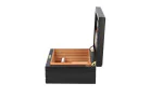 The Firenze Deluxe cigar humidor immediately catches the eye with a sleek multi-lacquered black finish, deep-set grooved lines and gold-plated lock and key for a rich, distinguished character. The solid construction is immediately apparent upon opening the thick, form-fitting lid, which is aided by strong hand-polished 24K gold quadrant hinges. Inside the expert creation, steamed Spanish cedar veneer and adorini’s deluxe gold-plated humidifier work together to provide ideal conditions for up to 68 Corona-size cigars.