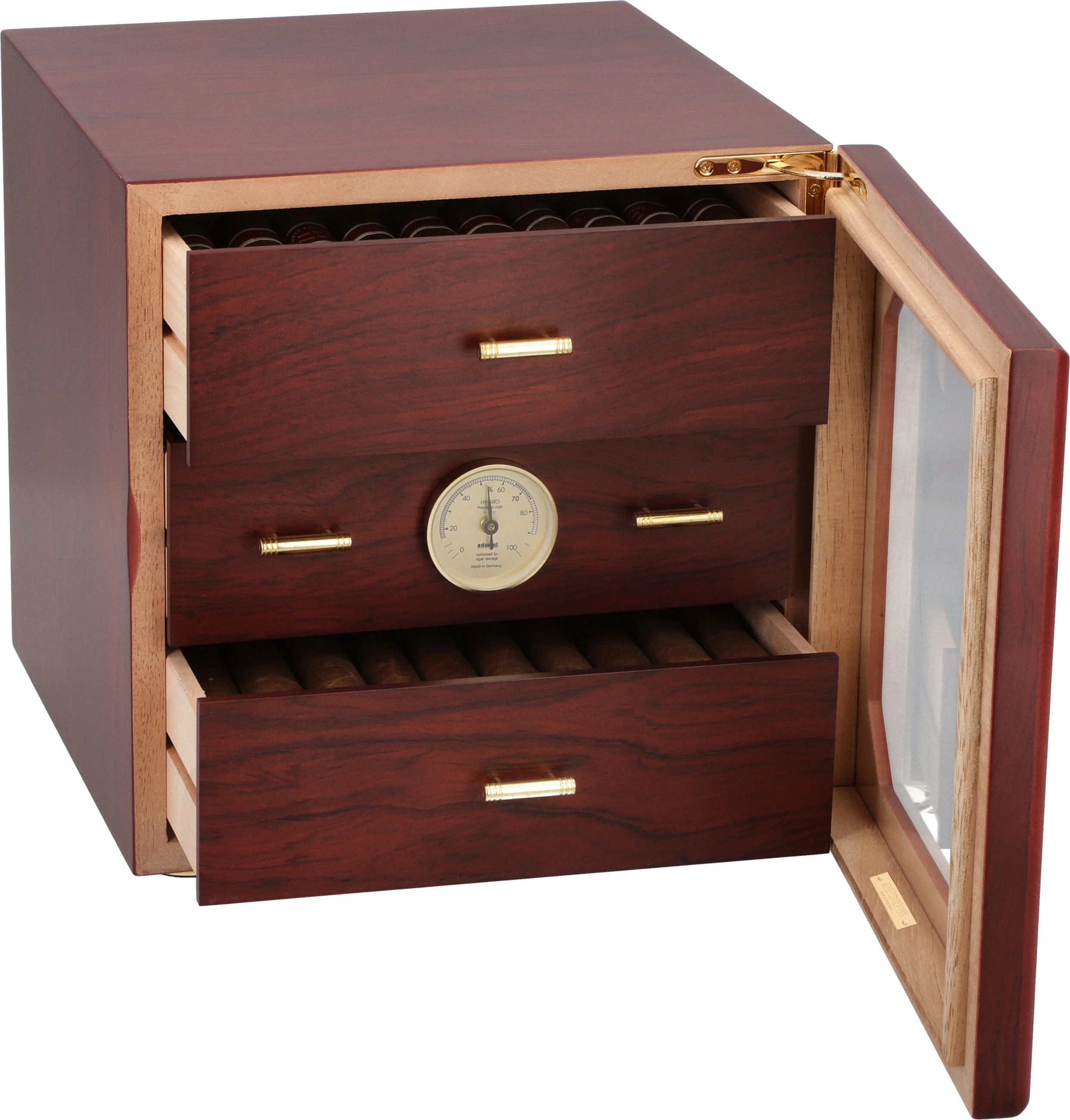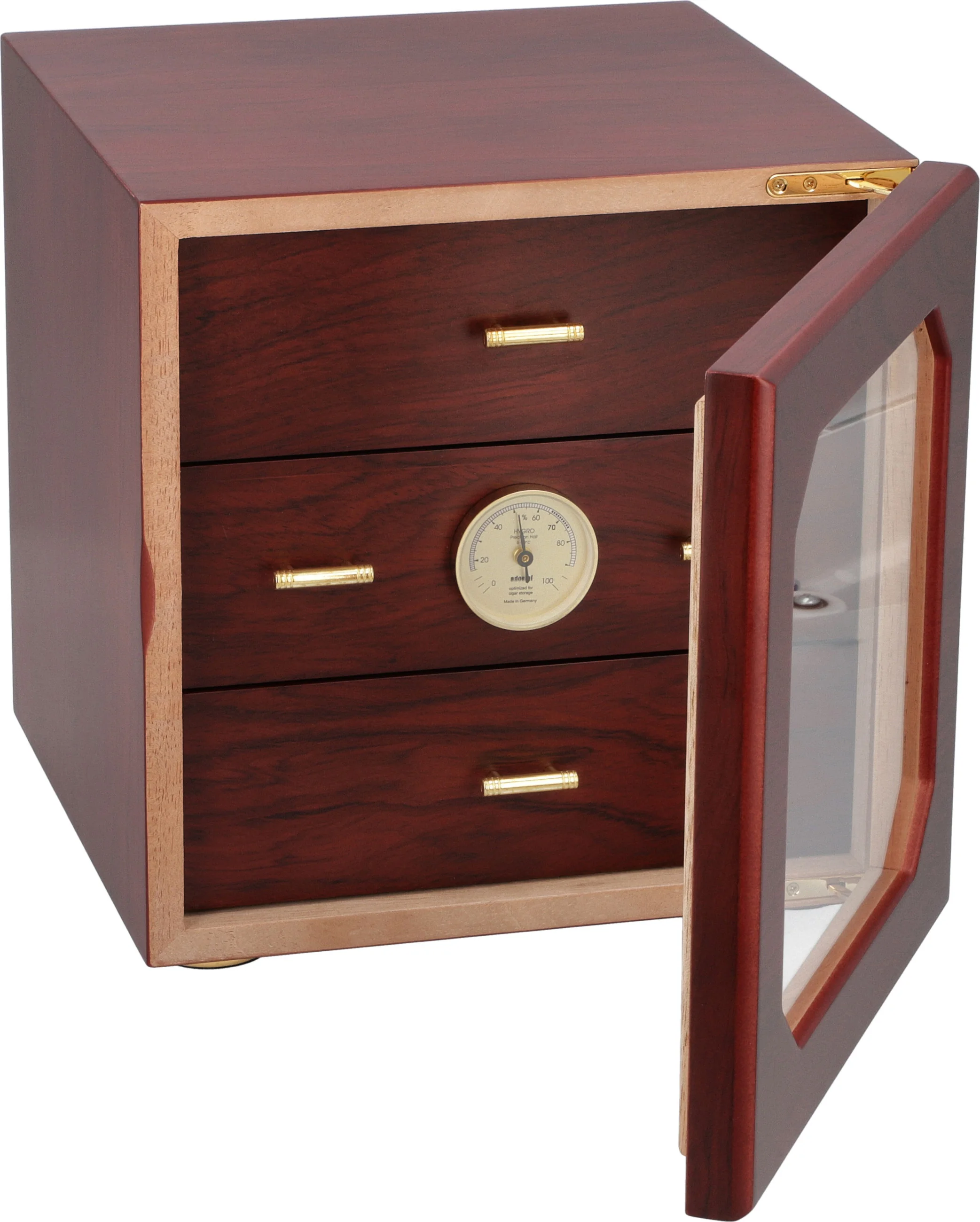 With the unique cabinet-style design and appealingly dark reddish-brown hues of a rosewood finish, the Chianti Medium Deluxe humidor is ideal for those wanting to get away from overly plain boxes colored a boring black. The conspicuous creation features gold-plated accents and a front-opening door with glass viewing pane, which makes an eye-catching centerpiece for any room or office. The steamed Spanish Cedar interior features three sliding cedar drawers with adorini’s RibTech ventilation ribs, which help to enhance the airflow around your cigars. Adding to the flexibility the humidor offers is yet another of adorini’s innovations, a drawer divider system with label clips that allows you to separate and better organize your cigars.