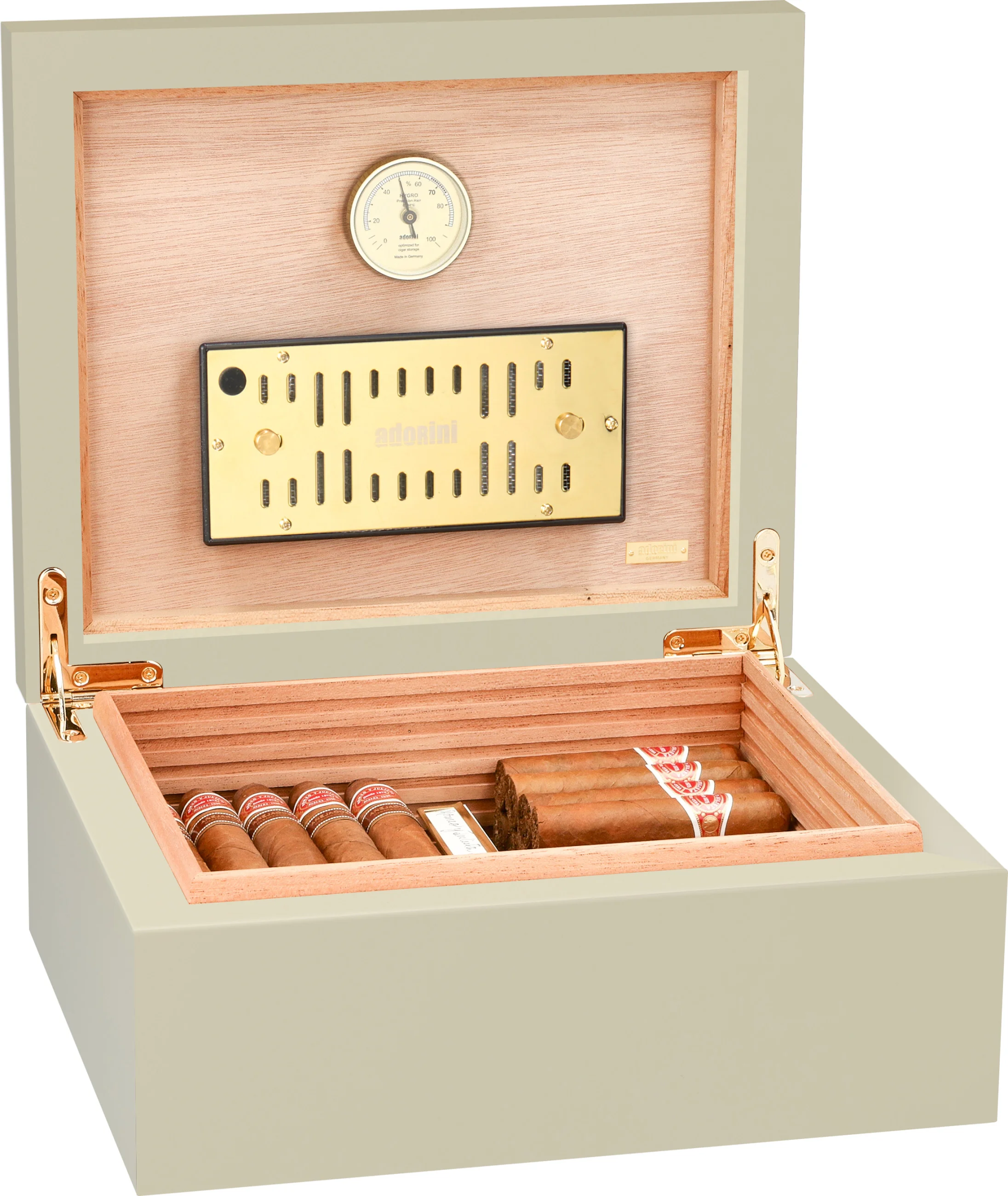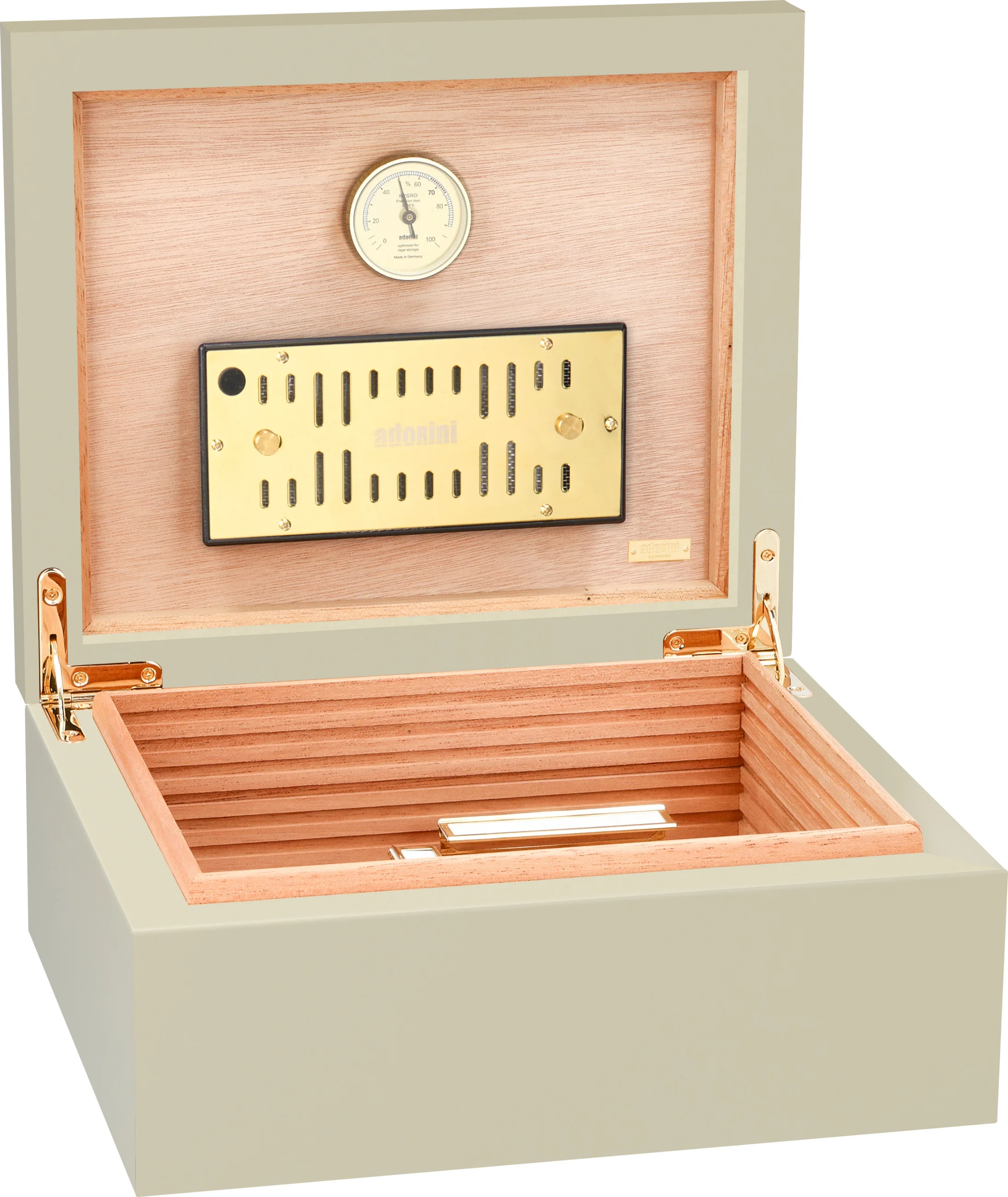 The adorini Humidor Medium Deluxe Ivory is part of the new adorini collection in four exciting color variations. This model impresses with its elegant, timeless cream white finish, enhanced by gold elements on the interior. Particularly noteworthy is the matte soft-touch finish, which extends beyond the outer edge and is thus also visible on the interior. This gives the humidor a harmonious and elegant overall effect.