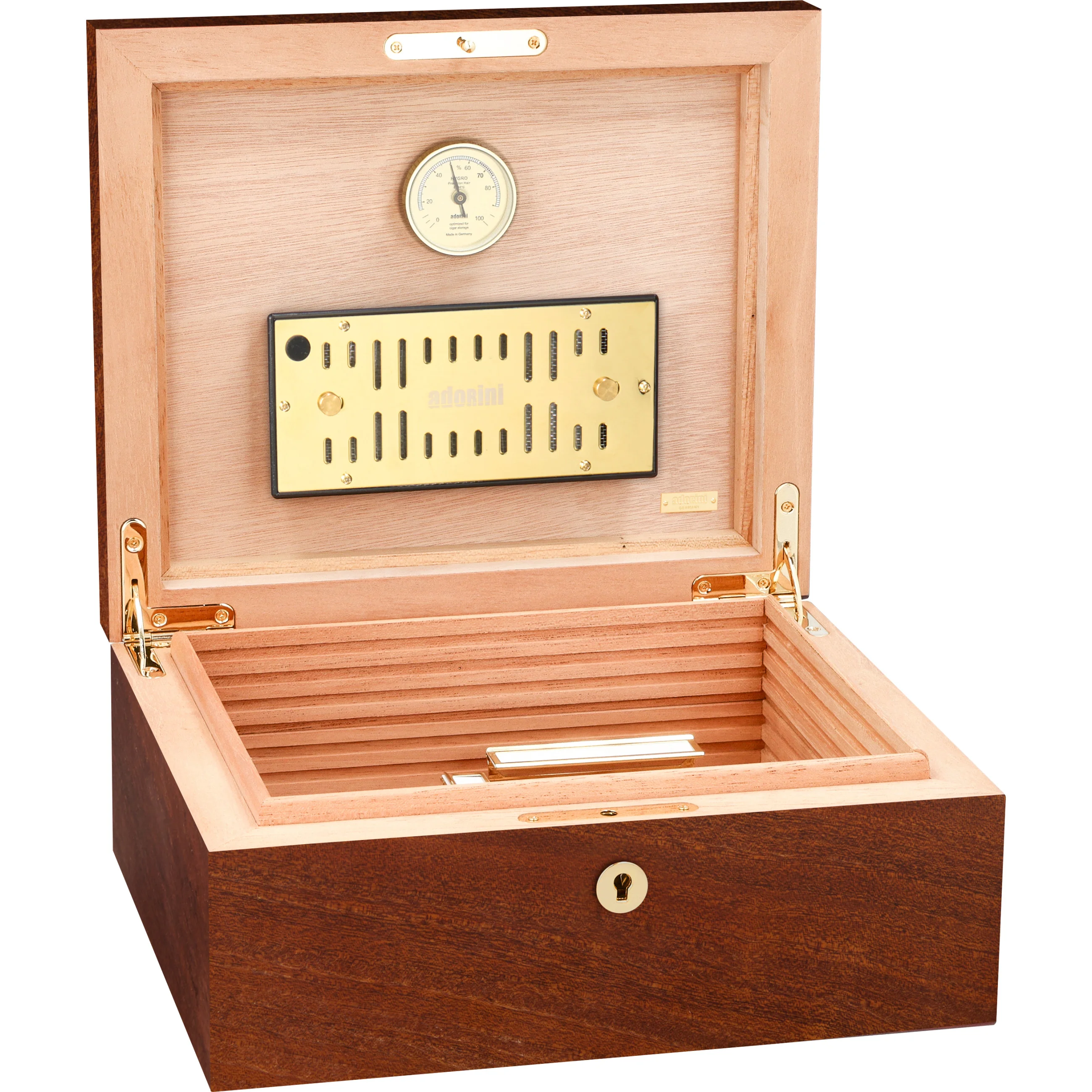The adorini Humidor Siena Mahogany Medium Deluxe is an elegant medium-sized humidor that impresses with its attractive mahogany veneer. Slight variations in grain and color highlight the natural character of the real wood veneer and make each humidor unique.