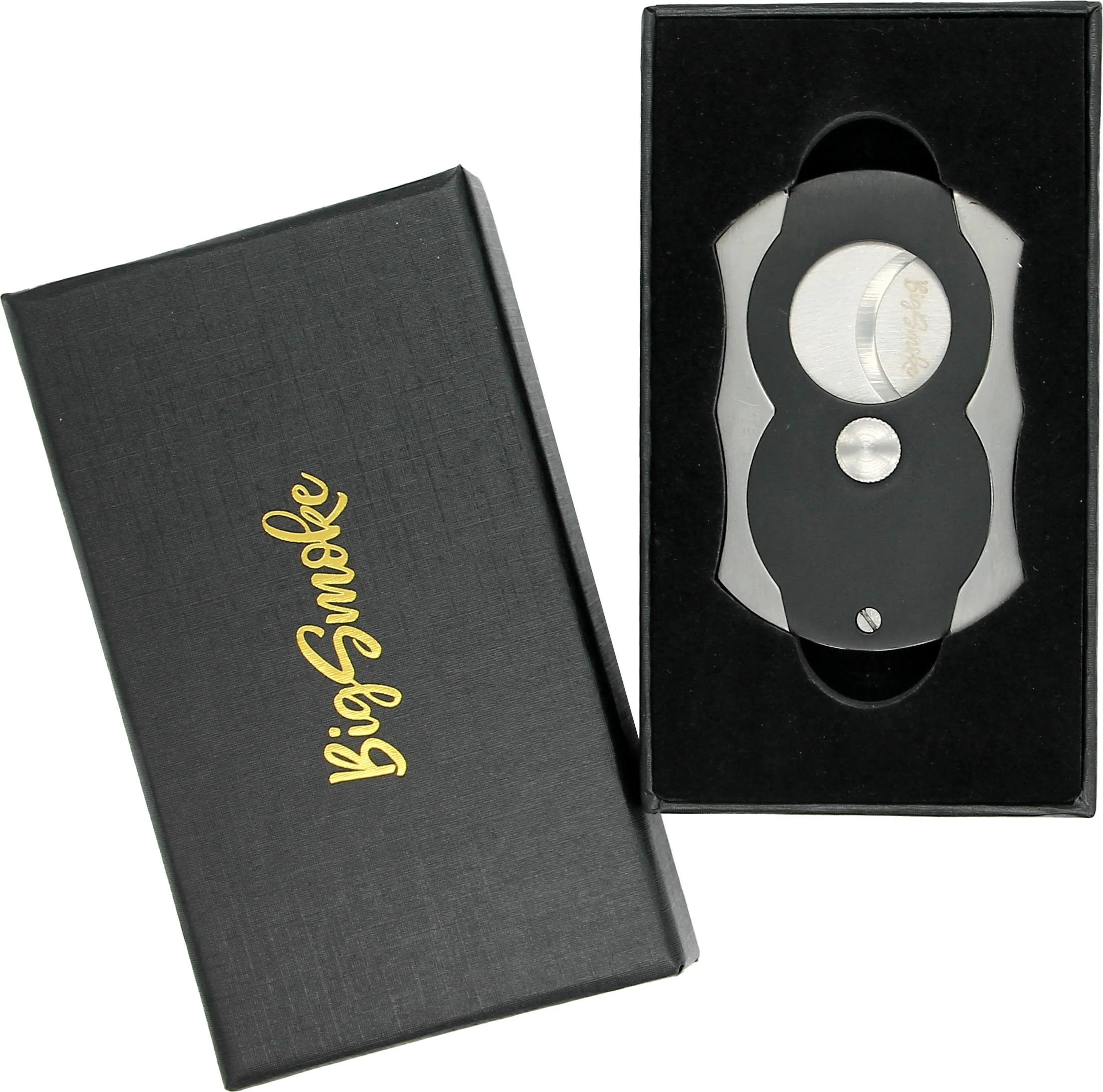 - Double blade cigar cutter of the brand BigSmoke in black and silver