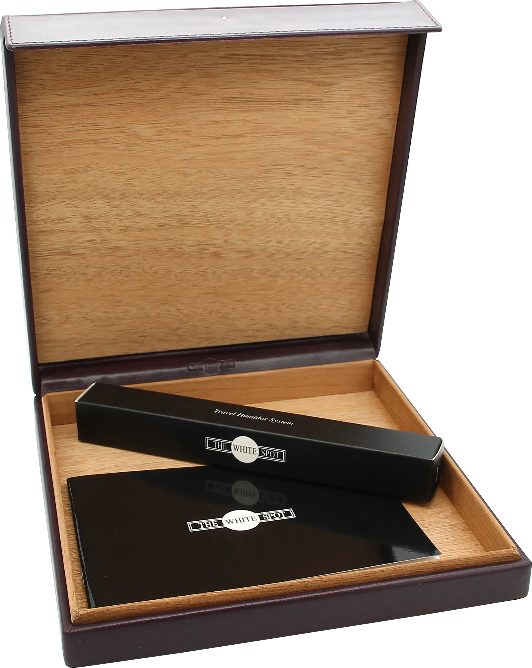 This elegant travel humidor in dark purple from the renowned English heritage brand Dunhill is the perfect companion for on the go. Covered in the finest leather from Spain and lined with high-quality wood, it offers space and protection for approximately 10 cigars. The closure is a magnetic clasp hidden beneath the leather. The embossed bulldog logo on the leather is an unmistakable Dunhill trademark, as is the famous White Spot on the front of the humidor. A sophisticated travel humidor that stylishly protects your cigars and proves to be a reliable companion on all your travels and trips.