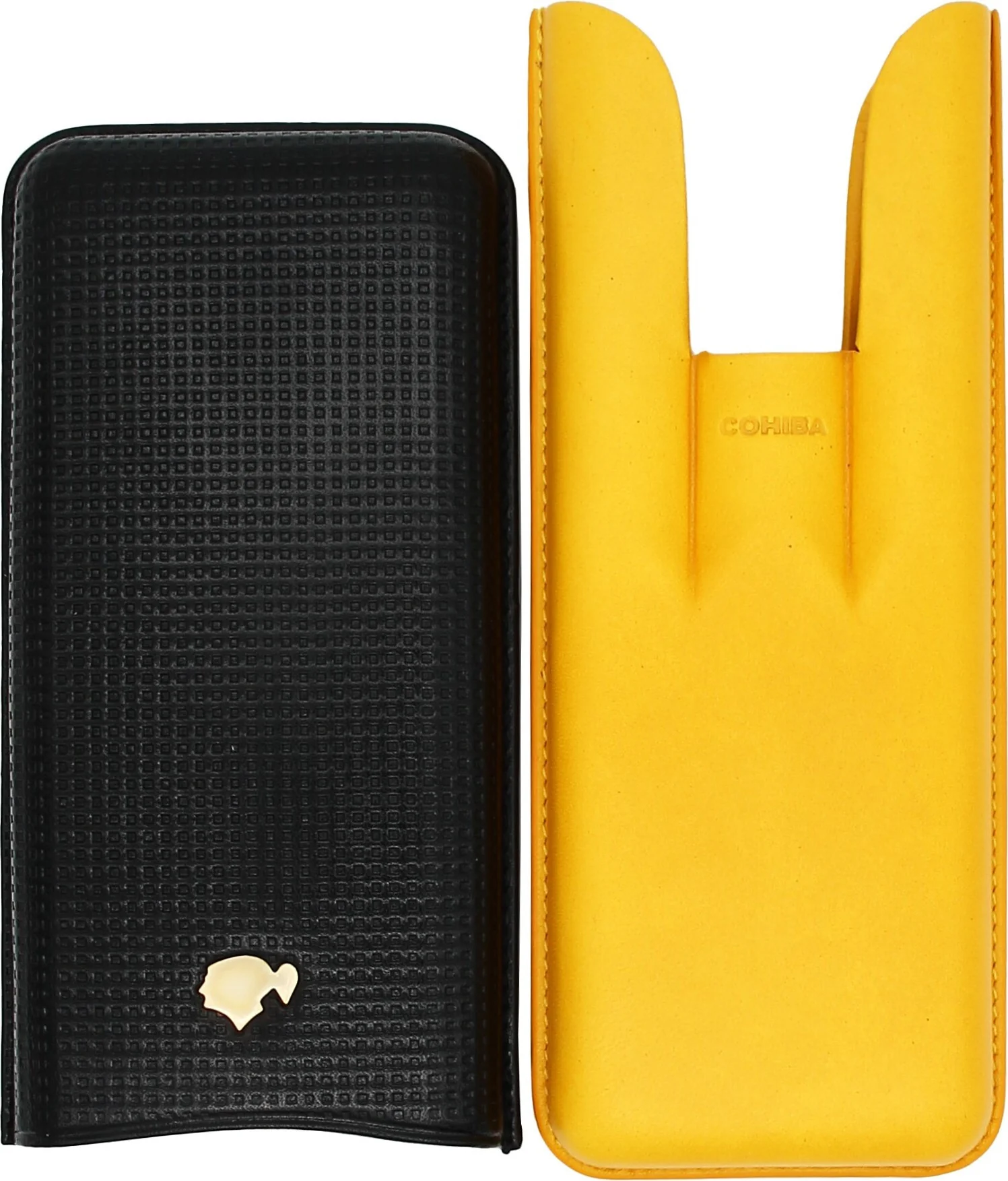 The striking genuine Spanish leather cigar case immediately catches the eye with its two-tone yellow and black colors, which those in the know will instantly recognize as an homage to the brand’s famous cigar band. The upper black portion of the case is decorated with a textured grid, fashioned after the Cohiba cigar band’s familiar square pattern. Cohiba’s iconic Taino silhouette in silver finishes it off with a touch of elegance.