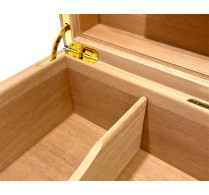 Other aspects of the interior add to each humidor's reliability and style, including heavy-duty hinges, usually of gold or silver plate. These hinges provide durability and smooth operation of the lid, helping to ensure the perfect seal. Many Elie Bleu humidors include attractive lock and key sets for added security, as well as cedar dividers to better organize cigars.