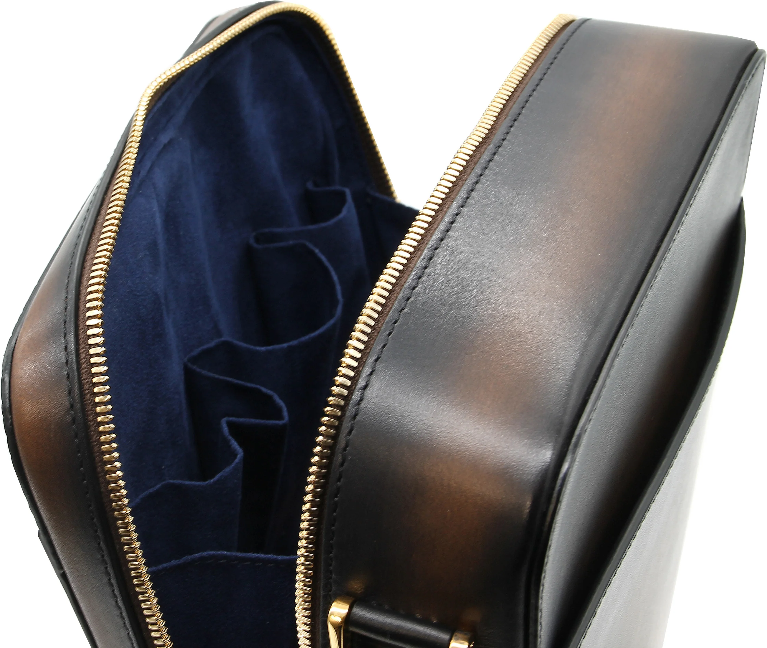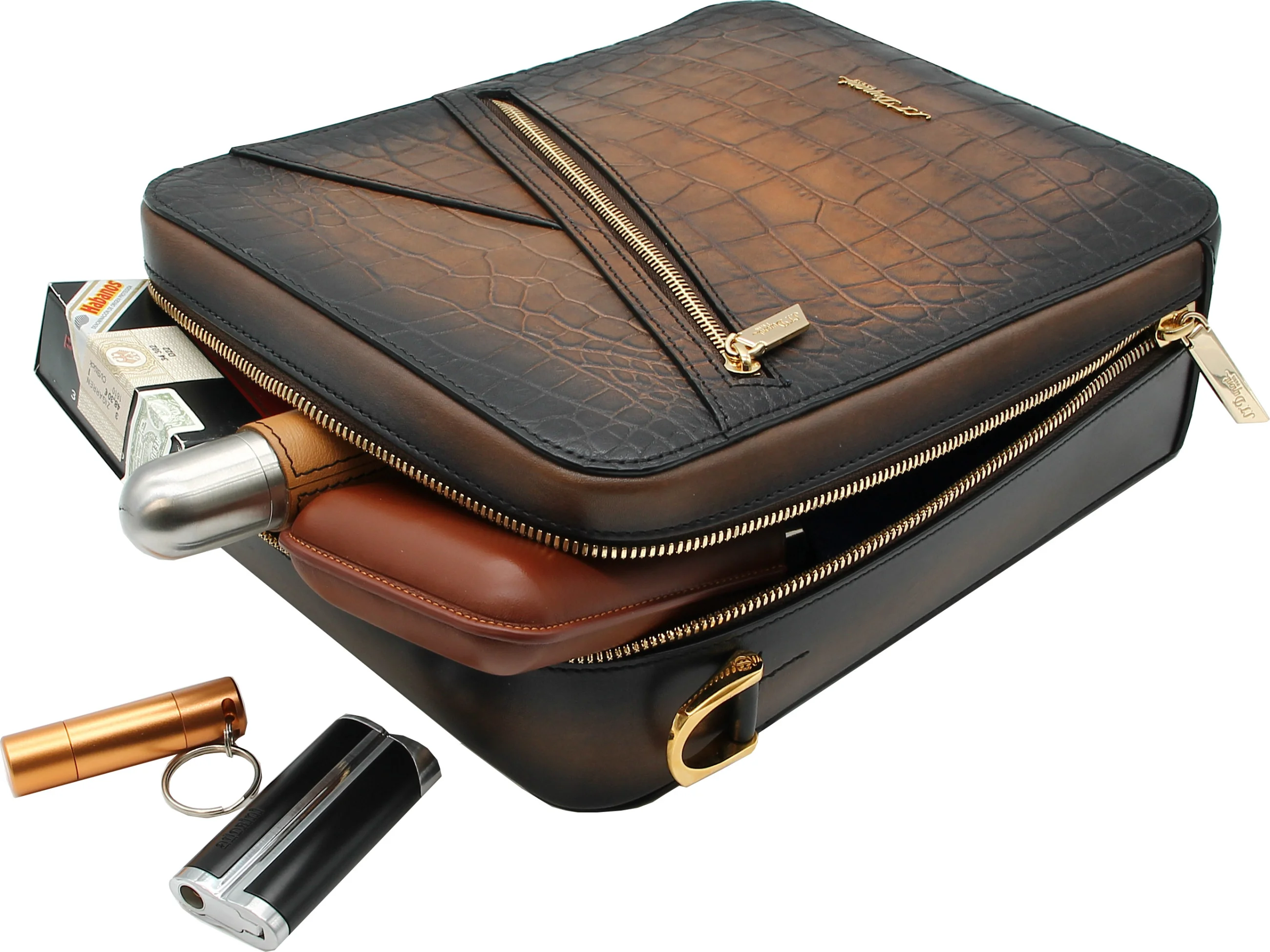 Inside the bag there are separate compartments for cigar accessories such as lighters and cutters, as well as special credit card compartments. This division ensures that all important utensils are stored safely and in an orderly manner. With dimensions of 25 x 20.5 x 7.5 cm, the bag offers enough space for your personal items and cigar accessories.