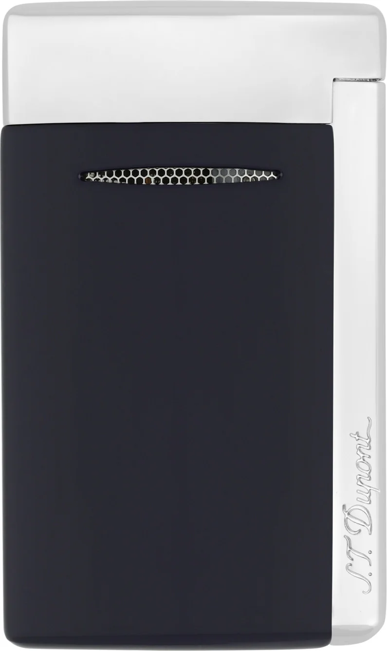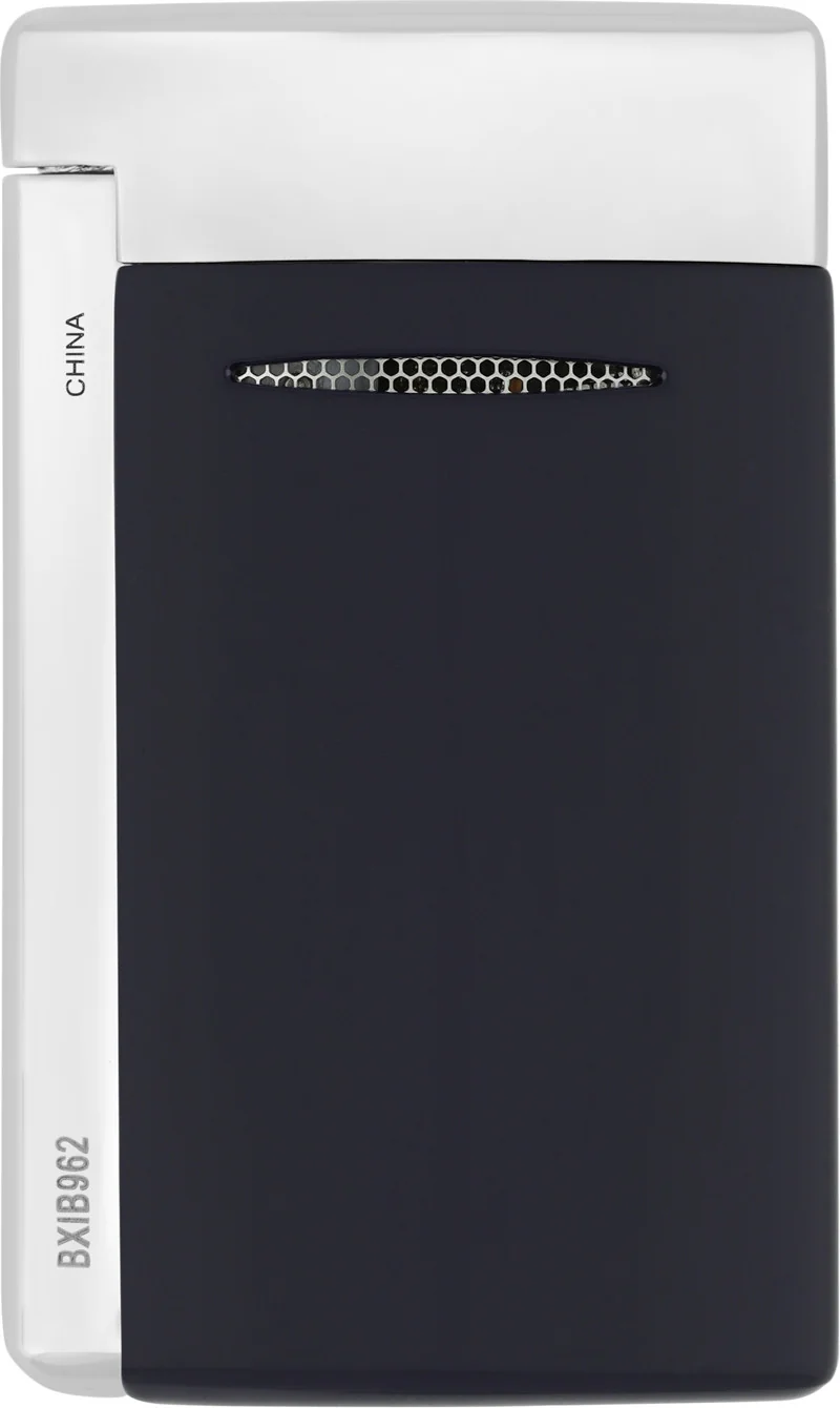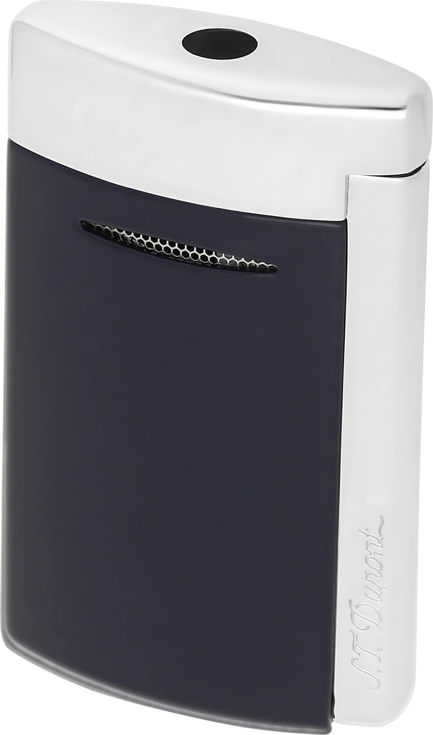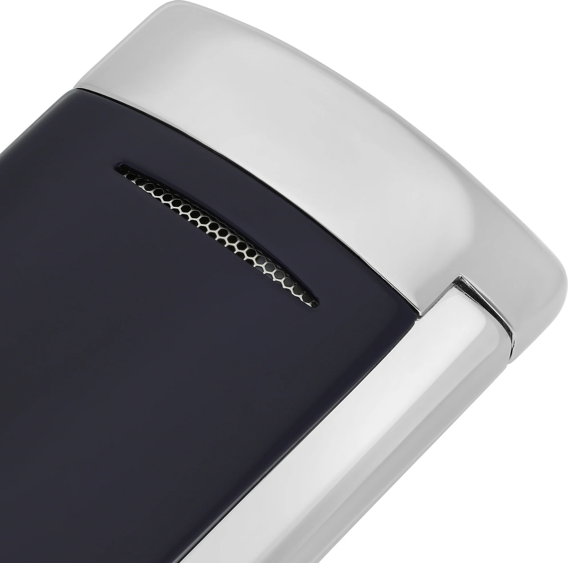 The S.T. Dupont Minijet lighter in deep blue with chrome accents is a sophisticated and handy lighter that impresses with its powerful jet flame and electric piezo ignition. The matte blue finish with polished chrome accents makes it a stylish accessory for everyday use.