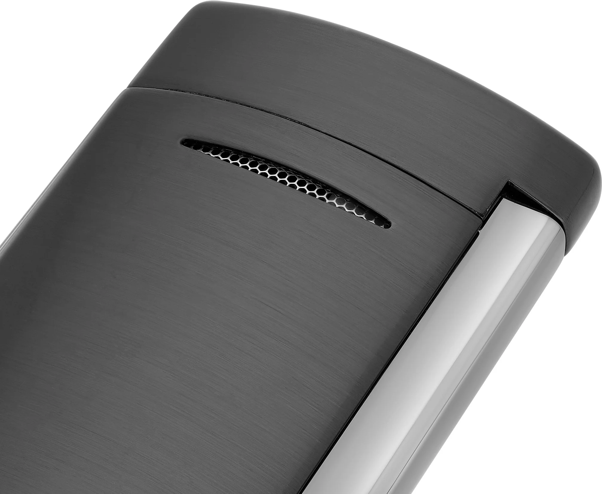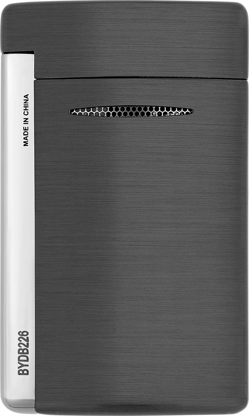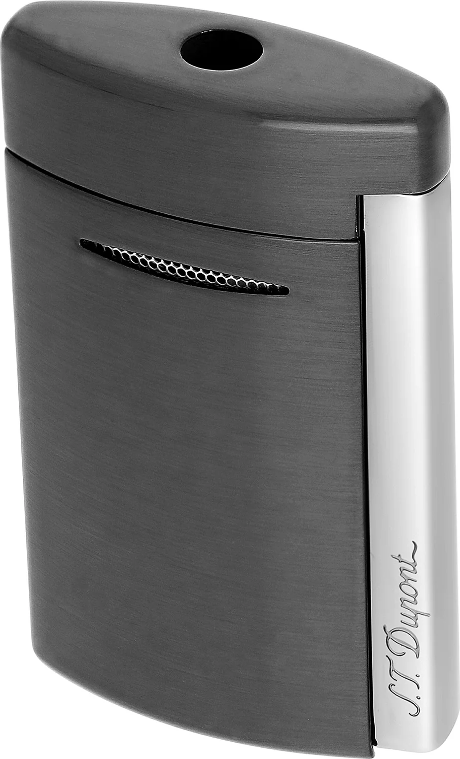 The S.T. Dupont Minijet lighter in brushed gun metal with shiny accents is a sophisticated and handy lighter that impresses with its powerful jet flame and electric piezo ignition. The brushed surface with polished chrome accents makes it a stylish accessory for everyday use.