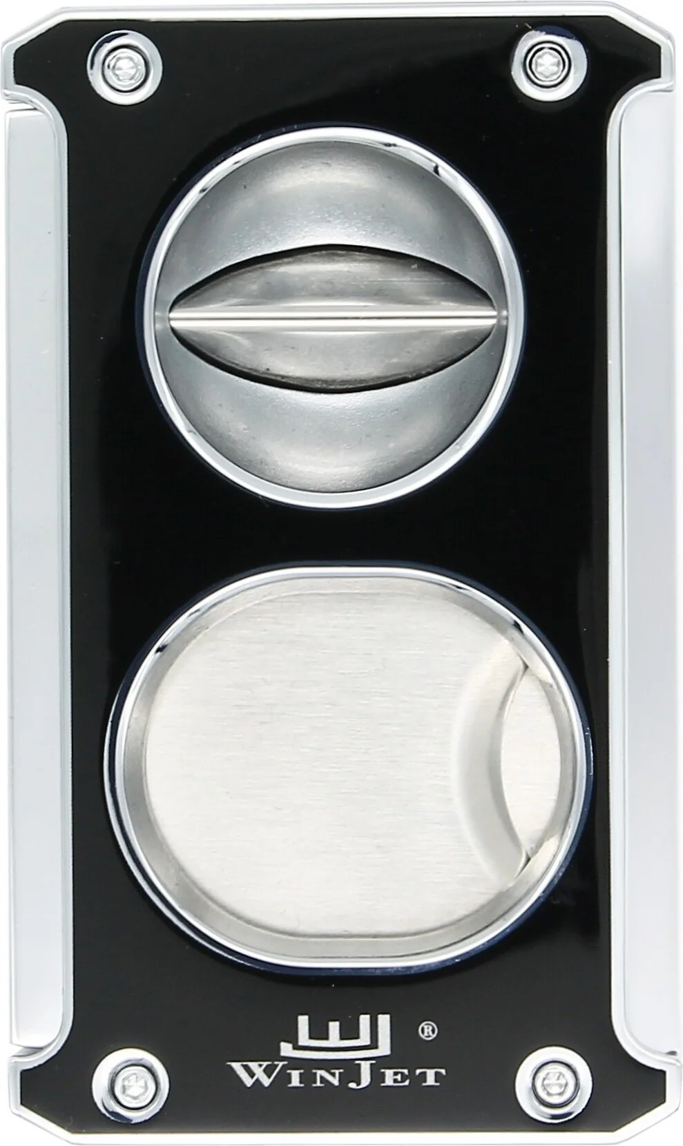 Enhance your cigar experience with the Winjet 3-in-1 Cigar Cutter in glossy black with silver accents. This versatile accessory caters to different preferences of cigar enthusiasts, combining a classic cut, V-cut, and cigar punch in a single tool.