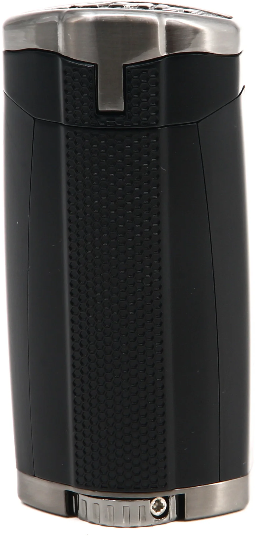 The protective lid and slide-down ignition trigger feature a honeycomb-shaped texture that provides a better grip, as well as a touch of panache. The HP3’s powerful inline triple jet flames deliver unparalleled control and coverage, letting you light cigars more efficiently no matter the weather conditions. You adjust the flames with the oversized adjustment wheel at the base of the lighter. Taking a glance at fuel levels has never been easier with the HP3’s large fuel level windows prominently located on the front of the lighter.